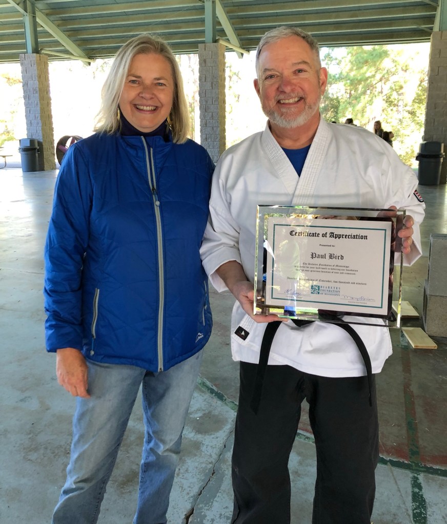 On November 9, 2019, Master Paul Bird was recognized by the Diabetes Foundation of Mississippi for years of volunteer service. Presenting the award is Irena McClain, the Associate Director of the DFM