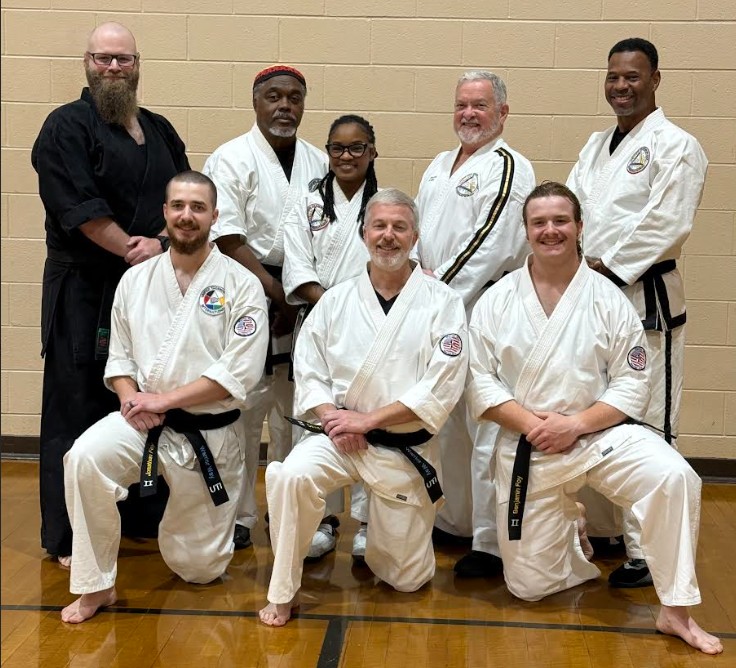 (Pictured left to right. Front Row. Jonathan Foy, David Foy, Benjamin Foy, new second degree black belts. Second Row is the Test Board. Ramsey Roberts, 3rd degree; Master Michael T Sharif, 6th degree; Kenecia Harris-Smith, 3rd degree, Master Paul Bird, 7th degree, and Grandmaster Greg Anderson, 8th degree.