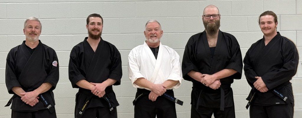 Pictured L to R David Foy 2nd degree, Jonathan Foy 2nd degree, Paul Bird 7th degree, Ramsey Roberts 3rd degree, Benjamin Foy 2nd degree